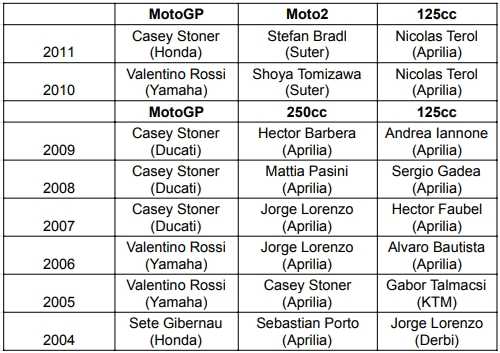 Jorge Lorenzo (MotoGP x3, 250cc x2, 125cc x1)