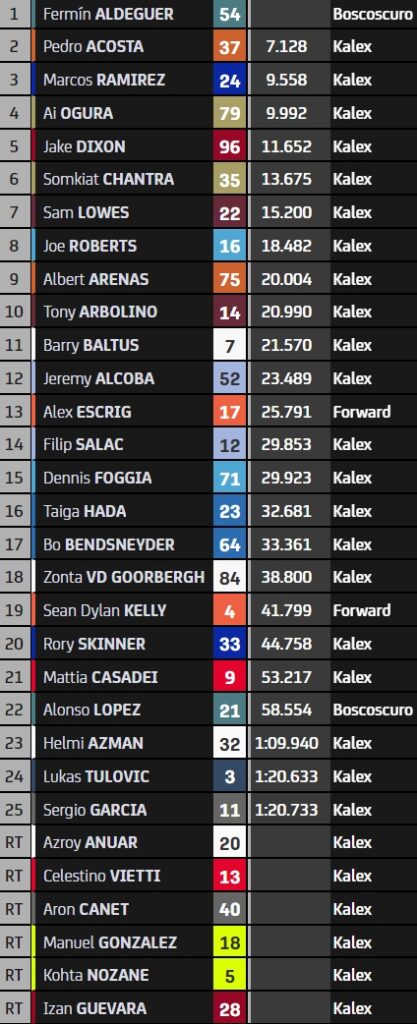 La course a été marquée par plusieurs chutes, dont celle de Manuel Gonzalez au départ, de ses compatriotes Canet et Sergio Garcia, ou encore de l’Italien Celestino Vietti. Resté sur ses roues, Barry Baltus a ramené sa Kalex aux stands avec la onzième place finale. Le Belge met fin à une série de trois résultats blancs et retrouve le sourire, enregistrant son meilleur résultat depuis le Grand Prix d’Inde.