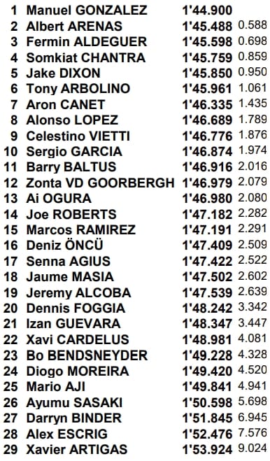 Manuel Gonzalez lance le week-end de Portimao avec le meilleur temps en catégorie Moto2, sur une piste qui comportait encore des traces d'humidité et de sable. Onzième place pour le Belge Barry Baltus.