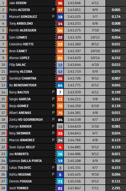 Malgré l’apparition de quelques gouttes de pluie en milieu de session, Jake Dixon s’est adjugé le meilleur temps de la première séance de l’année. Pedro Acosta et Manuel Gonzalez se placent derrière le Britannique. Tony Arbolino et Fermín Aldeguer complètent le top-5. Barry Baltus est 14e.