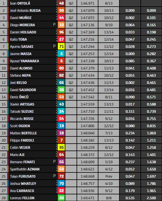 Ivan Ortolá s’est levé du bon pied ce matin. L’Espagnol a signé le meilleur temps des essais libres en battant le record de la piste. Le pilote Angeluss MMA Team domine José Antonio Rueda et David Muñoz. Deniz Öncü, quatorzième, se qualifie in extremis en Q2.Victime d’un petit accident en fin de session, Lorenzo Fellon termine dernier et va devoir passer par la Q1.
