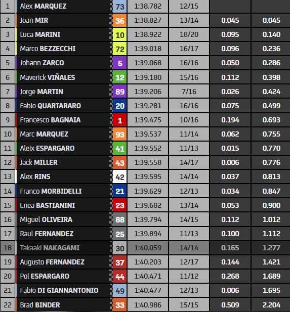 Au terme des 45 minutes de séance, Alex Marquez (Gresini Racing) s’est placé en haut de la feuille des temps grâce à un temps en 1’38’’782. Au guidon de sa Honda Repsol, Joan Mir termine au deuxième rang à 0’’045 du leader. Les pilotes Mooney VR46 Racing sont aussi dans le coup puisque Luca Marini est 3e (+0’’140) juste devant Marco Bezzecchi (+0’’236).