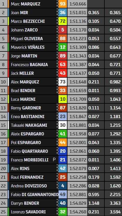 Héros local en quête de rédemption après deux courses manquées au Portugal l’an dernier, Miguel Oliveira (5e, +0.557) complète le top-5 à plus d’une demi-seconde de Marc Marquez. Maverick Viñales (6e, +0.643) suit au rang de meilleur pilote Aprilia, dans le même dixième que les Ducati Desmosedici GP22 de Jorge Martin (7e, +0.677), Francesco Bagnaia (8e, +0.721) et Jack Miller (9e, +0.771). Alex Marquez ferme la marche du top-10, mais l’écart avec son frère approche la seconde (10e, +0.0.982).