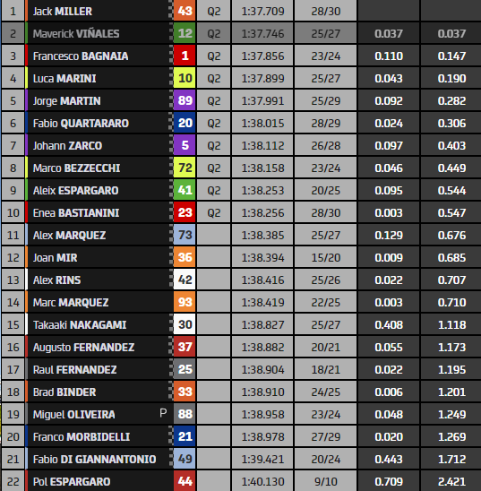 Hormis Jack Miller, les autres KTM sont toujours en difficulté. Augusto Fernandez est seizième à plus de six dixièmes de la qualification. Brad Binder finit à une lointaine dix-huitième place. Les Aprilia du team RNF passeront aussi par la Q1. Miguel Oliveira et Raul Fernandez sont tous les deux allés au tapis et finissent même hors du top-15.
