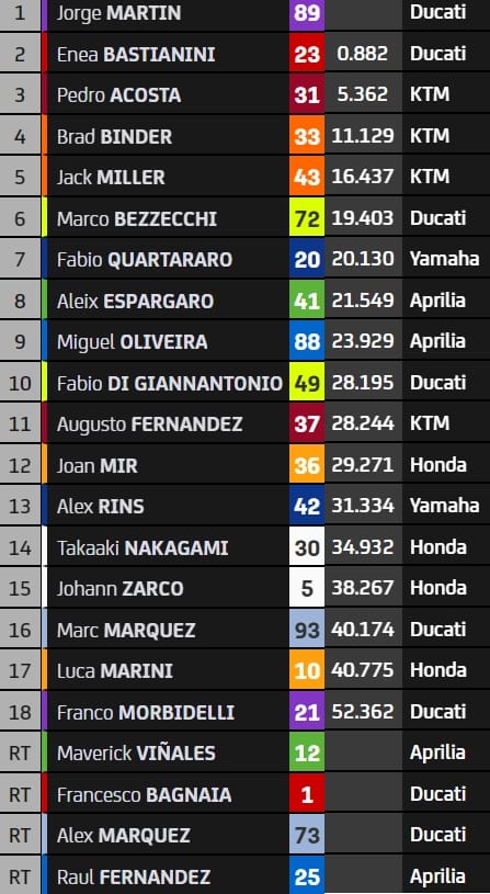 Martin prend la tête du classement général avec une avance de 18 points sur Binder et 21 sur Bastianini. La chute de Bagnaia le fait reculer au 4e rang à 23 longueurs du nouveau leader, son vice-champion du monde, bien décidé à lui dérober le titre cette saison.