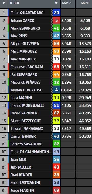 Cinquième avant le départ, Fabio Quartararo s’empare de la tête du championnat à égalité avec Alex Rins, qui pouvait difficilement imaginer pareil résultat en entrant sur la huitième et dernière ligne de la grille. Aleix Espargaro reste troisième à 3 points, tandis que Enea Bastianini glisse de la première à la quatrième place. Le top-5, complété par Johann Zarco, se tient en seulement 18 points.
