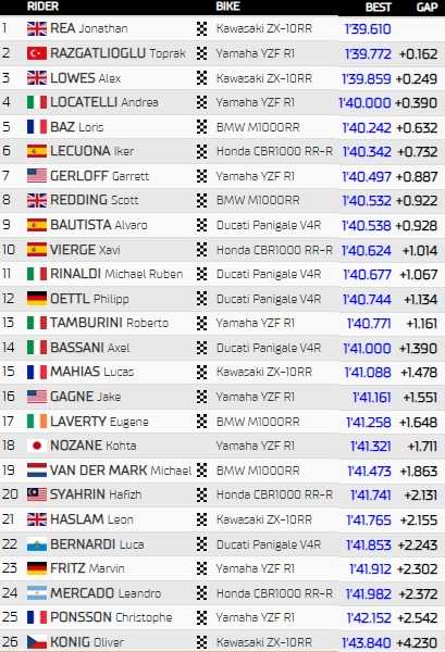 Meilleur temps des essais libres à Portimao, Toprak Razgatlioglu a été privé de la pole position par Jonathan Rea, parvenu à signer un chrono du tonnerre en 1’39.610. Une Kawasaki finit donc devant une Yamaha et une autre Kawasaki, celle d’Alex Lowes qui complète la première ligne. Le Français Loris Baz fait un très bon 5ème et meilleur pilote indépendant, alors que le leader du championnat, Alvaro Bautista, partira 9ème.