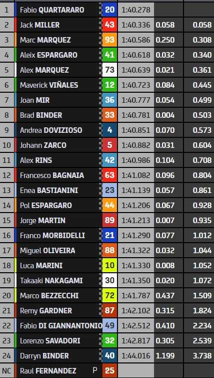 Championnat MotoGP actuel (4/21) : 1. Enea Bastianini 61 pts, 2. Alex Rins 56 (-5), 3. Aleix Espargaro 50 (-11), Joan Mir 46 (-15), Fabio Quartararo 44 (-17)… Classement complet ici