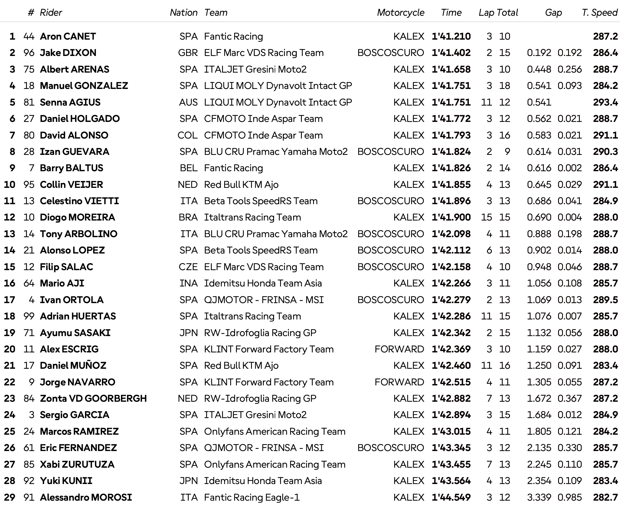 Albert Arenas, qui quittera le paddock du mondial en fin d'année, s'est adjugé le troisième temps devant Manuel Gonzalez. L'Espagnol, qui joue le titre face à Diogo Moreira, a terminé devant Senna Agius et les deux rookies du team Aspar, Dani Holgado et David Alonso.