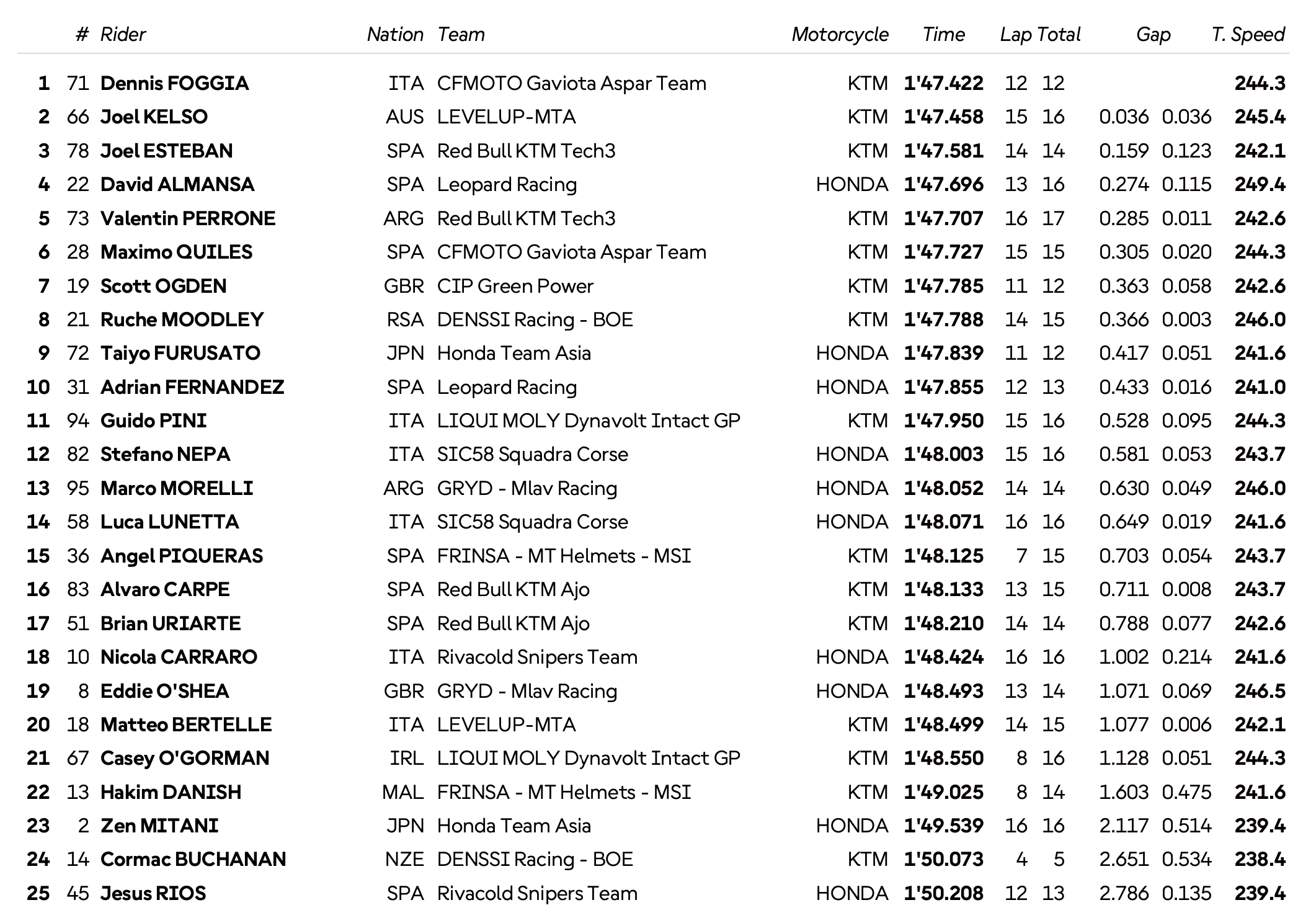 L'Italien s'est montré le plus rapide de la séance d'ouverture avec un chrono en 1'47.422. Il devance Joel Kelso de 36 millièmes tandis que Joel Esteban, qui remplace José Antonio Rueda, convalescent, est venu compléter le Top 3.