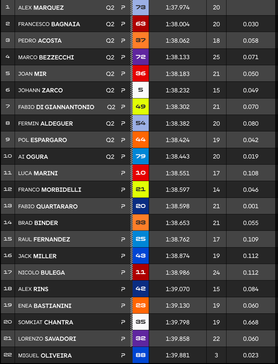 Pedro Acosta a quant à lui enregistré le troisième temps de la séance devant Marco Bezzecchi et Joan Mir. Johann Zarco rejoindra lui aussi la Q2 demain tout comme Fabio Di Giannantonio, Fermin Aldeguer, Pol Espargaro et Ai Ogura.