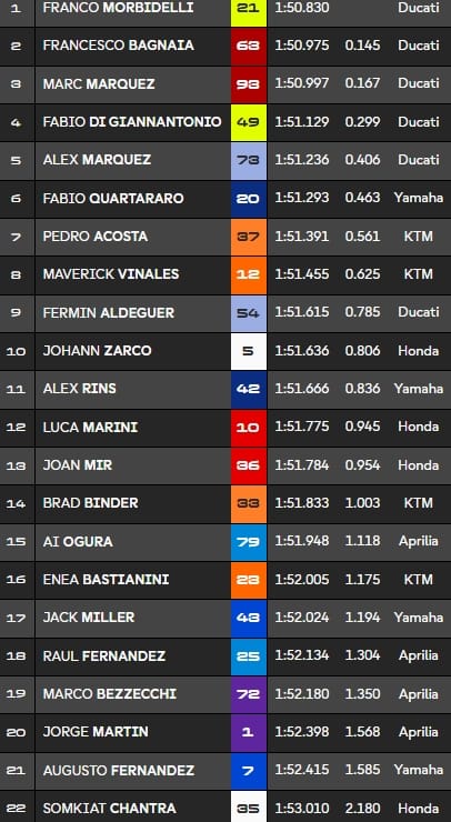 - Pedro Acosta (7e) et Maverick Viñales (8e) mettent KTM en première partie de classement. Tombé, leur camarade Brad Binder (14e) sera lui en Q1 avec les Honda officielles de Luca Marini (12e) et Joan Mir (13e), Jack Miller aussi à la faute (17e), ainsi que toutes les Aprilia. Pas de miracle pour Jorge Martin (20e) de retour de blessure, mais son coéquipier Marco Bezzecchi (19e) n'est pas non plus devant.