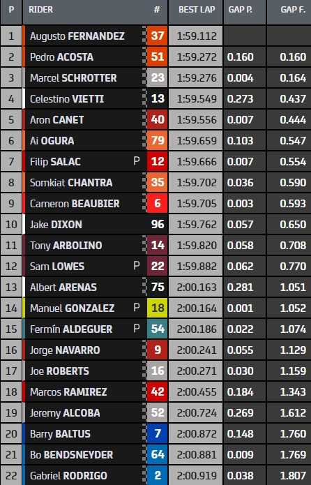 Augusto Fernandez meilleur temps devant Pedro Acosta : l’équipe Red Bull KTM Ajo termine la première journée du Grand Prix du Qatar sur un doublé, comme elle en avait l’habitude en 2021 avec Remy Gardner et Raul Fernandez. Le Belge Barry Baltus termine vingtième.