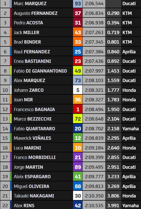 Marc Marquez a joué le jeu et bouclé 11 tours, signant un 2'06.544 qui le place au sommet de la hiérarchie. Une première pour lui en tant que pilote Ducati. Il devance les quatre KTM RC16 d'Augusto Fernandez, Pedro Acosta, Jack Miller et Brad Binder. Johann Zarco s'insère dans le top-10, tandis que Fabio Quartararo est resté prudent et se classe 14e.