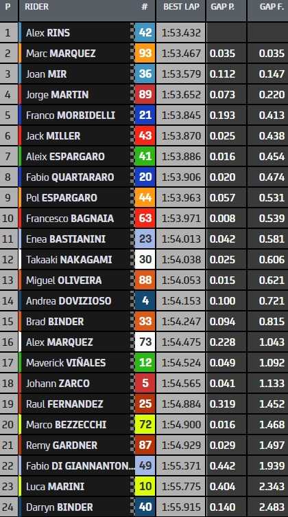 Alex Rins termine la première journée du Grand Prix du Qatar au sommet de la hiérarchie, juste devant Marc Marquez. Joan Mir et Jorge Martin complètent un top-4 100 % espagnol. Huitième, Fabio Quartararo est provisoirement en Q2.