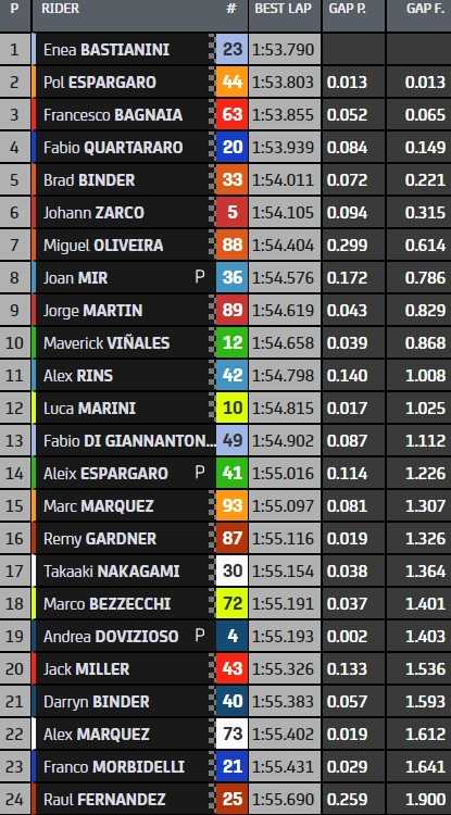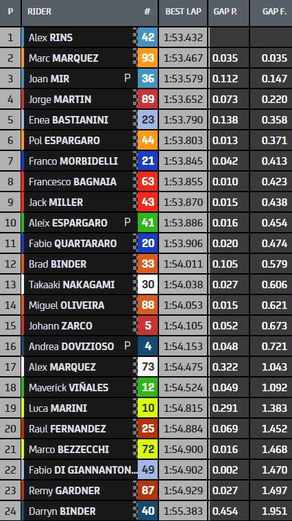 Pilotes qualifiés pour la Q2 : Alex Rins, Marc Marquez, Joan Mir, Jorge Martin, Enea Bastianini, Pol Espargaro, Franco Morbidelli, Francesco Bagnaia, Jack Miller, Aleix Espargaro. Les 14 autres se retrouveront en Q1, où les deux meilleurs accéderont à la Q2.