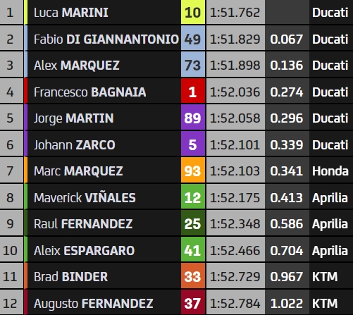Il fallait passer sous les 1’52 pour entrer en première ligne. Le premier à y parvenir a été Fabio di Giannantonio, auteur d’un surprenant 1’51.829, lui qui cherche toujours un guidon en MotoGP. Inspiré par son coéquipier, Alex Marquez s’est lui aussi illustré en signant un 1’51.898 qui assuraient alors un doublé à l’équipe Gresini Racing. C’était sans compter sur le dernier effort de Luca Marini, poleman pour 0,067 s devant « Diggia » en 1’51.762. Le pilote VR46 signe la deuxième pole position de sa carrière, et peut-être la dernière au guidon d’une Ducati puisqu’il devrait rejoindre Honda en 2024.