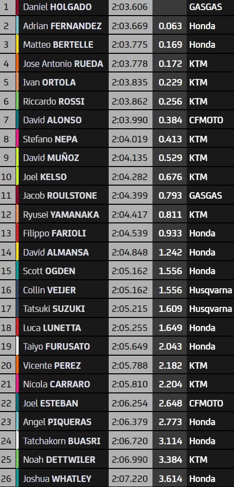 Daniel Holgado enregistre le meilleur temps du jour en 2'03.606 au guidon de sa KTM/GasGas, et empêche ainsi Honda de signer un doublé puisqu'il a derrière lui Adrian Fernandez (+0.063) et Matteo Bertelle (+0.169). José Antonio Rueda (+0.172) est au pied du podium de la séance tandis qu'Ivan Ortola (+0.229) complète un top-5 composé de 4 Espagnols. Ça commence fort pour les représentants de la péninsule ibérique. La suite samedi.
