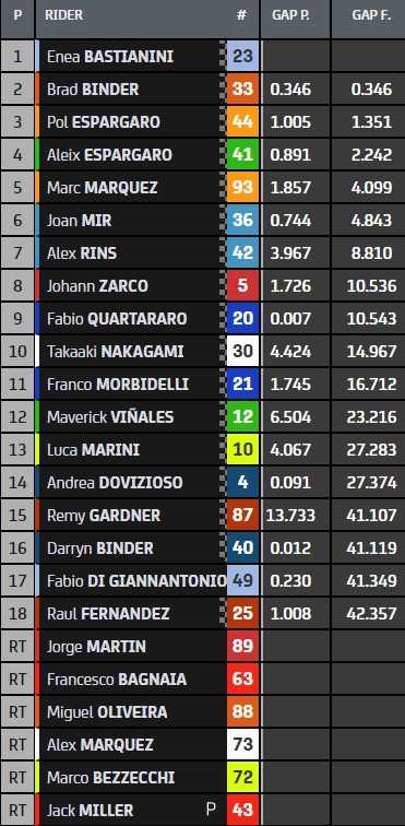 L’Italien est en jambes et monte en puissance au fil des kilomètres. Il double Brad Binder pour la deuxième position au 14e des 22 tours, alors que Pol Espargaro vient d’ouvrir un gap d’une seconde. Une petite seconde qu’il va réduire à néant en l’espace de cinq boucles. Propulsé par une Ducati redoutable, Enea Bastianini double Pol Espargaro dans la ligne droite des stands, à l’entame du 19e tour. Surpris, le pilote Honda se rate légèrement au virage suivant et cède une autre place à Brad Binder.