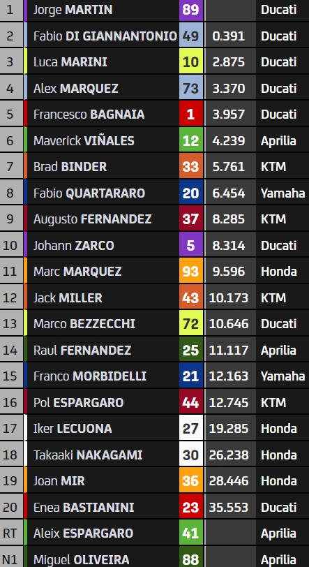 Passé en tête, Martin a dû résister à la pression de Di Giannantonio, qui n’a cependant pas pu trouver l’ouverture. Il remporte un sprint ô combien important puisqu’il lui permet de revenir à 7 points de Bagnaia, cinquième et menacé par Maverick Vinales dans les derniers hectomètres. L’Espagnol est le seul pilote Aprilia dans les points, tout comme Fabio Quartararo (8e) l’est pour autant. Le Français s’est frayé un chemin depuis le quatorzième rang de la grille et finit derrière la KTM de Brad Binder (7e). La dernière unité du jour va à Augusto Fernandez (9e), qui devance Johann Zarco de seulement 0,029 s.