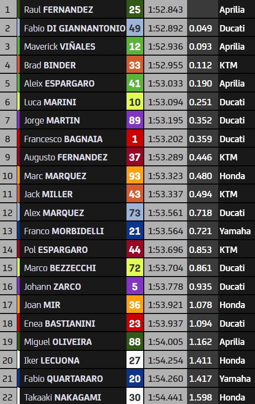 Dans l’attente de savoir ce qu’il fera en 2024, Fabio di Giannantonio performe (2e) et sera face à eux en Q2, tout comme les KTM RC16 de Brad Binder (4e) et de l’expérimenté rookie Augusto Fernandez (9e). Luca Marini (6e) a lui aussi assuré l’essentiel, de même que Marc Marquez (10e) qu’il devrait remplacer au Repsol Honda Team l’année prochaine. L’octuple champion du monde a profité de la roue de Bagnaia pour enregistrer son 1’53.323, évitant de justesse d’être recalé en Q1.