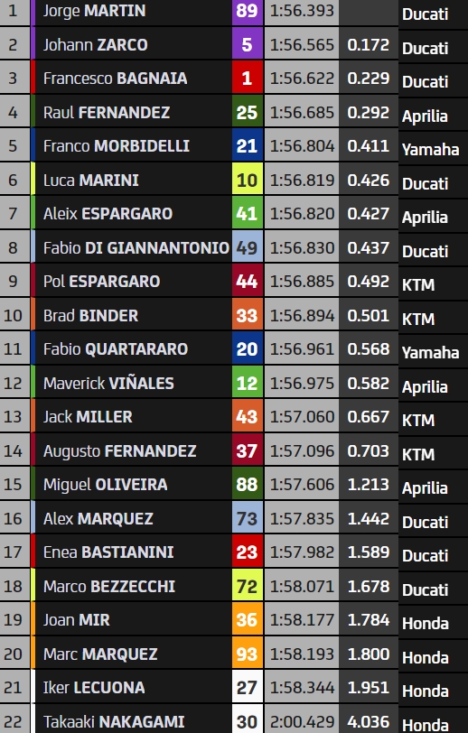Prima Pramac Racing, qui a l’occasion de décrocher le titre de champion du monde par équipes au Qatar, signe un doublé avec Johann Zarco pointé à 0,172 s de Martin. Bagnaia n’est pas loin, troisième à 0,229 s du leader. Le duel pour le titre mondial anime déjà les débats, alors que le soleil commence à se coucher sur l’émirat. Le premier pilote non-Ducati est Raul Fernandez, quatrième au guidon de son Aprilia. Il faut descendre au cinquième rang pour trouver une moto qui n’est pas italienne : la Yamaha de Franco Morbidelli.