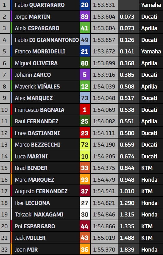 Fabio Quartararo a signé le meilleur temps de la deuxième séance d’essais libres du Grand Prix du Qatar, qui est dédiée à la préparation de la course. Le Français a un excellent rythme mais va maintenant devoir se sortir du repêchage. Il a devancé les Espagnols Jorge Martin et Aleix Espargaro, qui ont signé exactement le même temps.