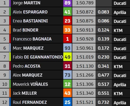 S'il s'agit de la 5e pole d'affilée de Ducati sur la piste qatarie, Aprilia a bien failli volé la vedette à la marque de Borgo Panigale. Aleix Espargaro échoue en effet à 0,083s de son compatriote et se présentera à sa droite sur la grille de départ. Il sera entouré de Desmosedici puisque la 3e place est revenue à Enea Bastianini. L'Italien confirme son retour en forme et fait mieux que son coéquipier Bagnaia, 5e. Brad Binder s'insère entre les deux Ducati officielles au 4e rang, ce qui fait de lui le 1er pilote KTM.