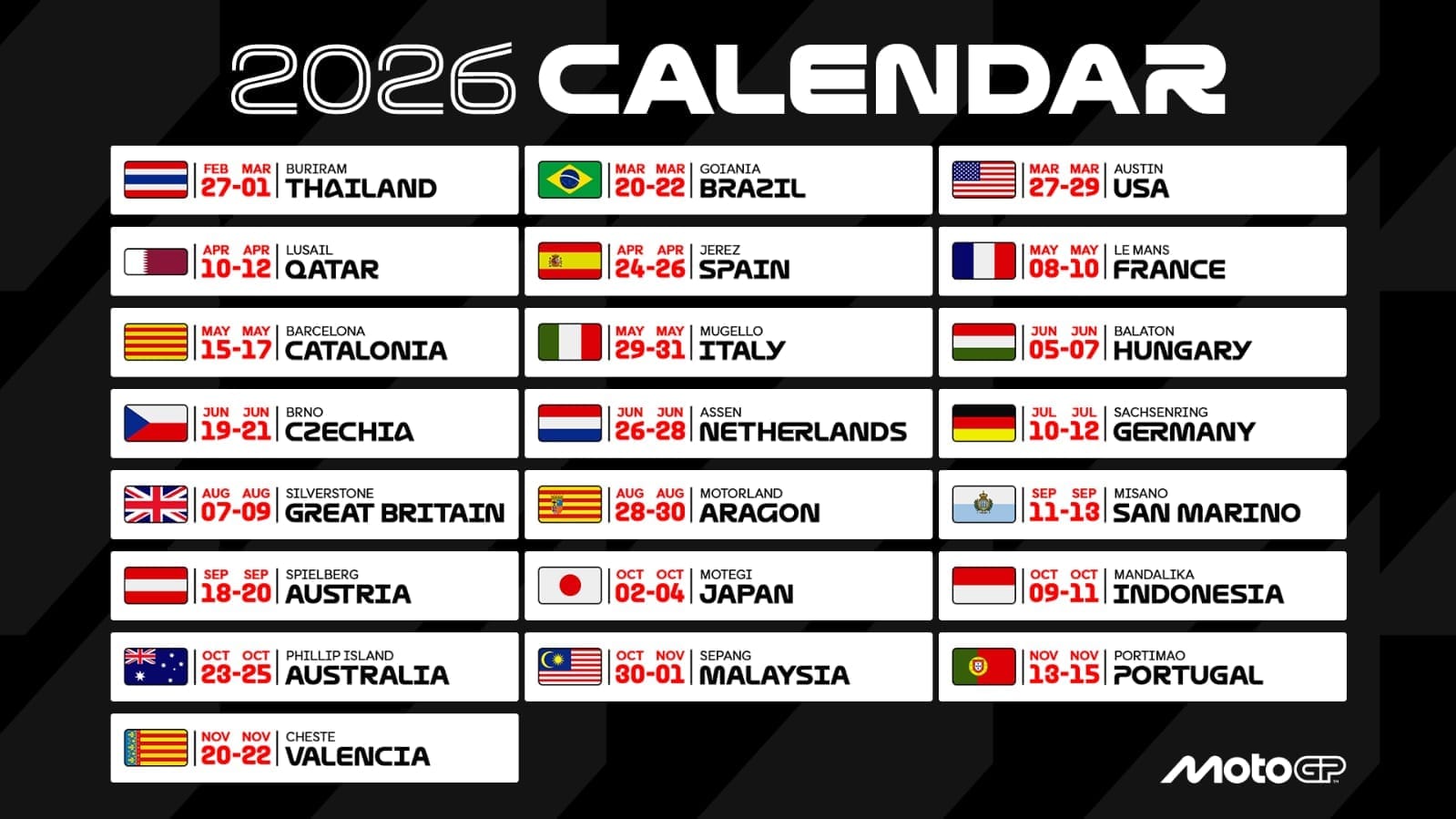 Le championnat du monde MotoGP 2026 débutera ensuite avec le Grand Prix de Thaïlande à Buriram (27 février au 1er mars), avant de se rendre au Brésil (20-21-22 mars), aux États-Unis (27-28-29 mars) et au Qatar (10-11-12 avril). Le premier Grand Prix européen sera celui d'Espagne à Jerez, du 24 au 26 avril.