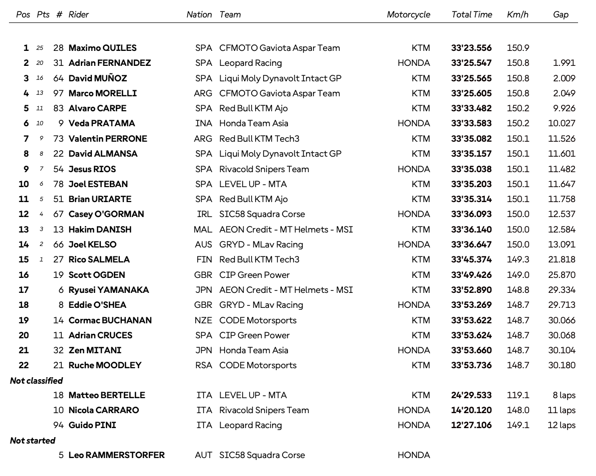 Parti 11e sur la grille, Marco Morelli, coéquipier de Quiles chez Aspar, arrache la 4e position, à 40 millièmes de Muñoz.