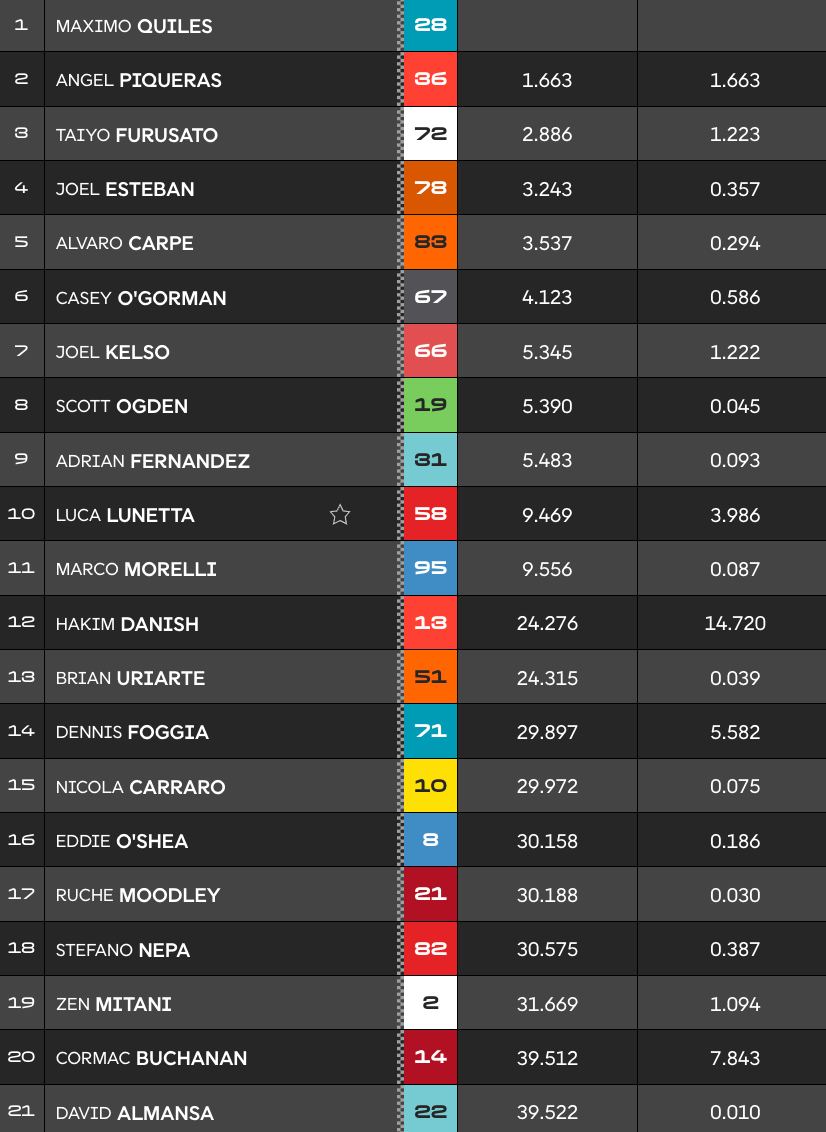 Quiles a réussi à s'extirper du groupe pour se mettre à l'abri et filer tout droit vers son troisième succès devant Piqueras. Vainqueur en Malaisie, Furusato est venu compléter le podium devant Joel Esteban et Alvaro Carpe.