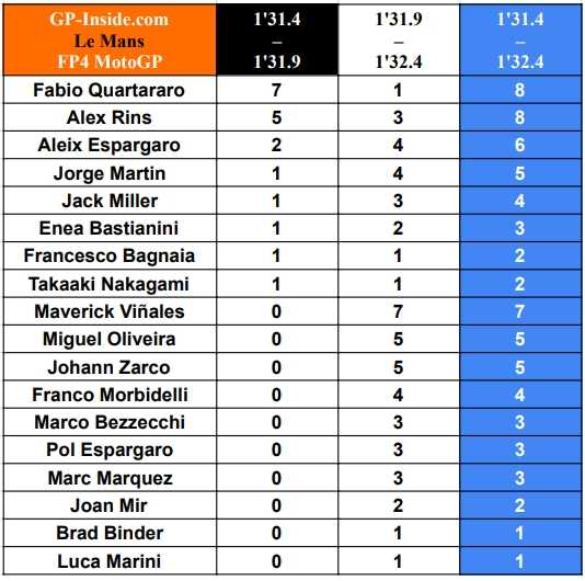 Personne n’a fait mieux, mais Alex Rins n’est pas loin du tricolore, avec 5 tours dans cette fenêtre et 3 dans la suivante (1’31.9 – 1’32.4). Le pilote Suzuki a de la cadence, mais sa huitième place sur la grille risque de le pénaliser. Derrière, Aleix Espargaro, Jorge Martin ou encore Jack Miller ont montré de belles choses en FP4. Le poleman, Francesco Bagnaia, n’a pas brillé, mais une bonne partie de ses chronos ont en fait été annulés.