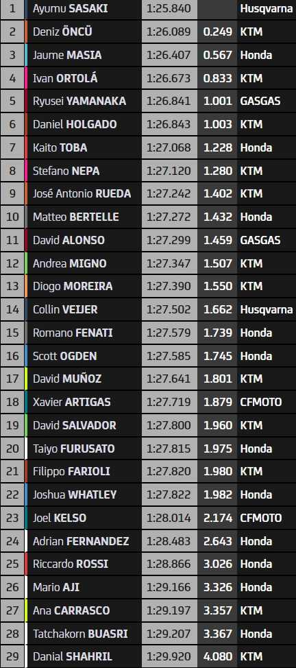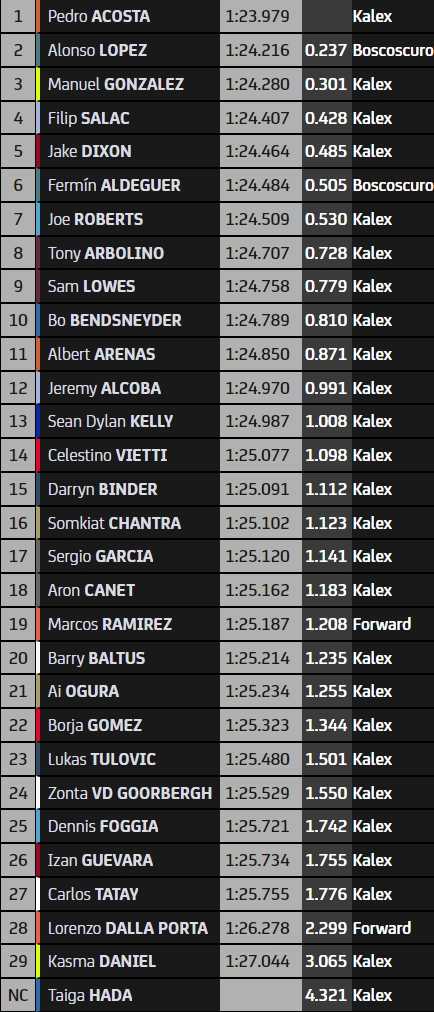 Le leader du championnat, Tony Arbolino (9ème), son dauphin Pedro Acosta (1er) et le troisième homme, Alonso Lopez (2ème), sont pour l’instant dans le bon groupe. S’y trouvent d’ailleurs la plupart des gros poissons de la catégorie intermédiaire, à l’exception d’Aron Canet (18ème). Le Belge Barry Baltus (20ème) fait partie de ceux qui devront progresser pour entrer en Q2.