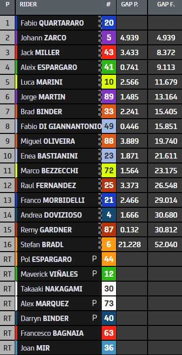 Étonnant cinquième en qualification, le rookie Fabio di Giannantonio termine juste derrière le Sud-Africain et enregistre son premier top-10 en MotoGP. Il devance la deuxième KTM officielle de Miguel Oliveira (9e), mais aussi son coéquipier chez Gresini, Enea Bastianini (10e), en retrait tout au long du week-end. Suivent les débutants Marco Bezzecchi (11e) et Raul Fernandez (12e), ce-dernier décrochant son meilleur résultat dans la catégorie.