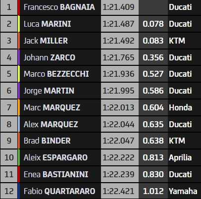 Bagnaia, lui, n’a pas connu pareil destin, et son 1’21.409 a été suffisant pour remporter la qualification. Il ouvrira la piste devant son compatriote Luca Marini et l’Australien Jack Miller, seul pilote non-Ducati du top-6 au guidon de sa KTM. La deuxième rangée sera ouverte par Johann Zarco en début de sa chute, qui l’a empêché d’effectuer une dernière tentative pour aller chercher la pole. Bezzecchi et Jorge Martin seront à ses côtés sur une deuxième ligne 100 % Ducati.