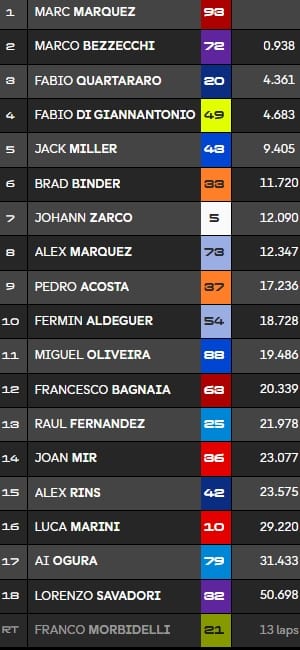 Championnat MotoGP : 1. Marc Marquez 319 pts, 2. Alex Marquez 241 (-78), 3. Francesco Bagnaia 181 (-138), 4. Fabio di Giannantonio (-177), 5. Franco Morbidelli 139 (-180)... Classement complet à venir
