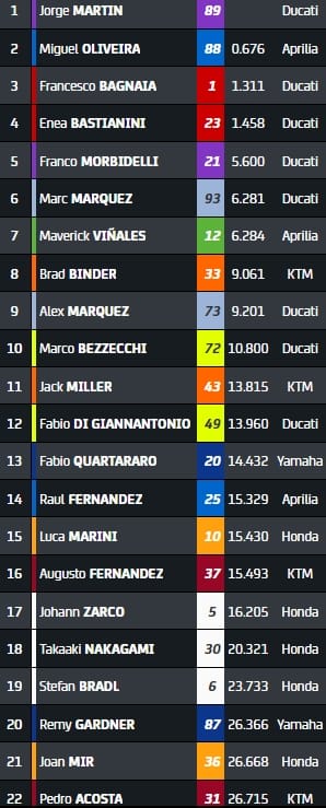 Deuxième, Oliveira décroche son premier podium en sprint et retrouve le sourire après un début de saison compliqué – il s'agit là de son premier top-5. Bagnaia complète le podium après avoir résisté à son coéquipier Enea Bastianini, arrivé dans ses échappements sans avoir pu l'attaquer. Franco Morbidelli finit cinquième, mais à 5 secondes du leader.