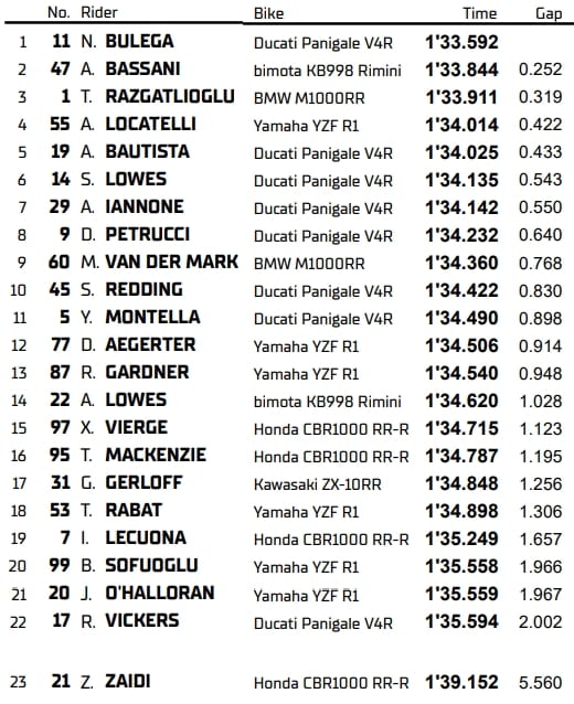 Nicolo Bulega termine la première journée du World Superbike d'Assen avec le meilleur temps, un 1'33.592 réalisé lors de la deuxième séance d'essais libres. Le pilote Ducati devance la Bimota d'Axel Bassani, la BMW de Toprak Razgatlioglu et la Yamaha d'Andrea Locatelli, ce qui donne 4 constructeurs dans le top-4 !