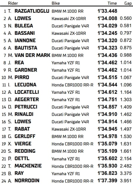 Toprak Razgatlioglu signe le meilleur temps de la première séance d'essais libres, devant la Kawasaki d'Alex Lowes et la Ducati de Nicolo Bulega. Le pilote BMW relègue ses adversaires à une demi-seconde. Le leader du championnat, Alvaro Bautista, est sixième.