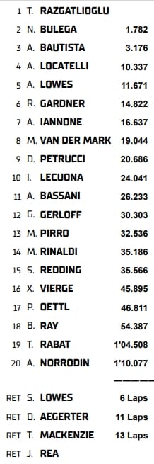 Cette quatrième victoire de la saison de Toprak Razgatlioglu lui permet de prendre la tête du championnat du monde Superbike, une première pour BMW depuis 2012. Il compte 3 points d'avance sur Alvaro Bautista.