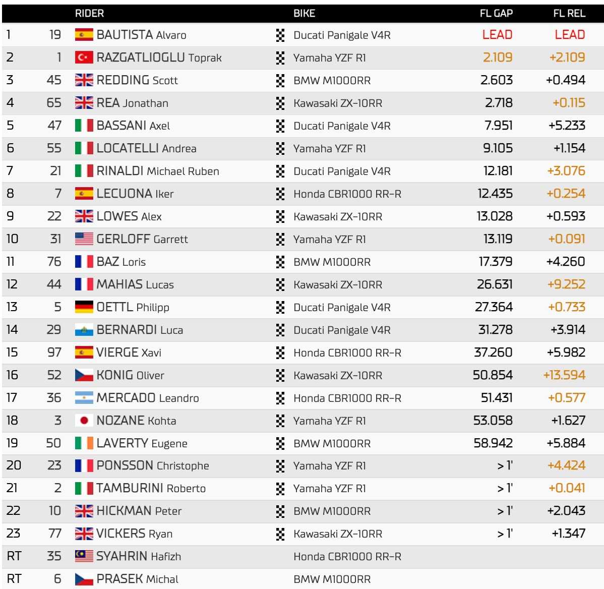 Championnat WorldSBK à Most (Course 1) : 1. Alvaro Bautista 271 pts, 2. Jonathan Rea 242 (-29), 3. Toprak Razgatlioglu 223 (-48), 4. Andrea Locatelli 134 (-137), 5. Michael Ruben Rinaldi 128 (-143), 6. Iker Lecuona 124 (-147), 7. Alex Lowes 113 (-158)…