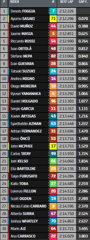Déjà meilleur temps de la première séance d’essais libres Moto3 à Sepang, Dennis Foggia a confirmé en dominant aussi la deuxième. Il est pour l’instant l’homme à battre, alors que son rival pour la médaille d’argent du championnat, Sergio Garcia, est bien plus loin (14ème). Le Français Lorenzo Fellon (25ème) devra trouver des solutions en FP3 pour s’éviter un passage par le repêchage.