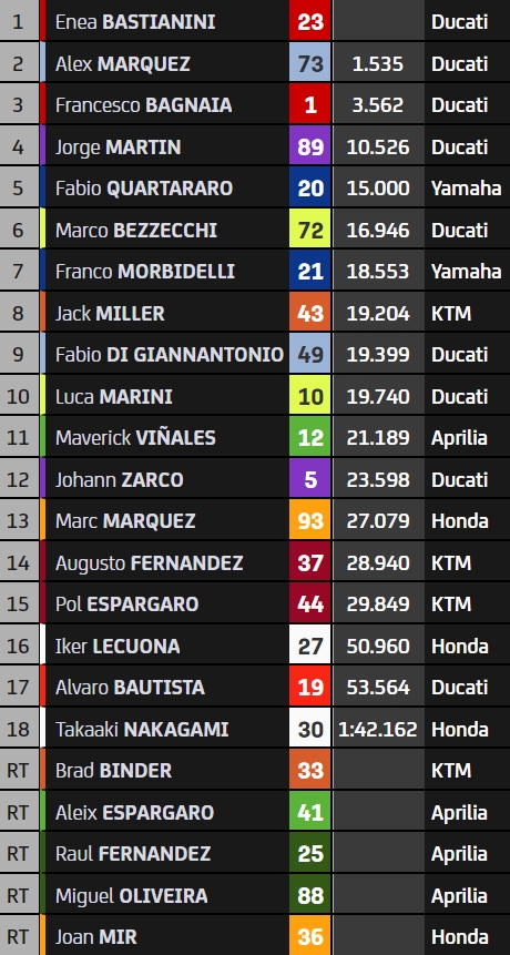 Sixième du jour, Marco Bezzecchi est désormais mathématiquement éliminé de la course au titre. Le pilote VR46 s’est fait reprendre dans les derniers tours par Fabio Quartararo, premier pilote non-Ducati du classement au cinquième rang. Le Français a réalisé une course solide après s’être plusieurs fois montré compétitif à Sepang, signant le meilleur temps de la deuxième séance d’essais libres et du warm-up. Il donne un peu de baume au coeur à son constructeur, Yamaha, qui enregistre un double top-7 avec Franco Morbidelli septième.