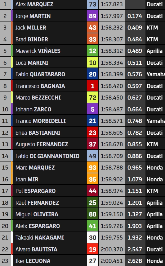 Le repêchage s’annonce disputé puisqu’on y retrouvera la Ducati officielle d’Enea Bastianini (douzième), celle de Fabio di Giannantonio (quatorzième) qui cherche à se montrer pour 2024, mais également les Honda Repsol de Marc Marquez (quinzième) et Joan Mir (seizième). La bonne surprise pourrait venir de Franco Morbidelli (onzième), le pilote Yamaha étant passé à quelques centièmes de la Q2 aujourd’hui. Le retour en MotoGP d’Alvaro Bautista, wild-card, s’avère plus difficile que prévu. Le double-champion du monde Superbike est avant-dernier à 2,5 secondes du leader.