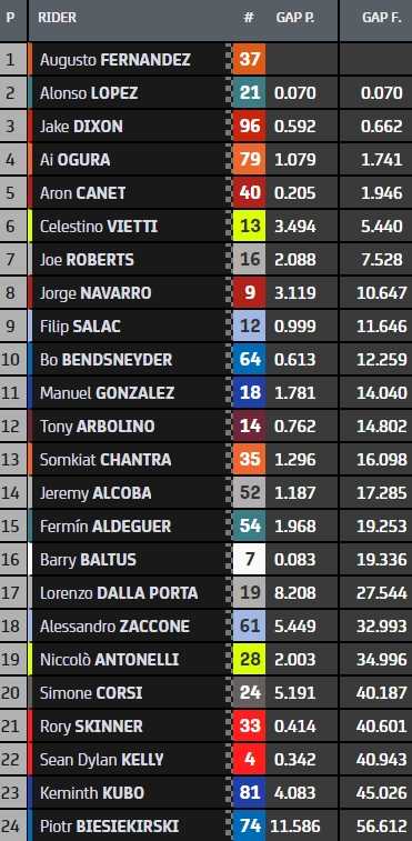 Championnat Moto2 après Silverstone (12/20) : 1. Augusto Fernandez 171 pts, 2. Ai Ogura 158 (-13), 3. Celestino Vietti 156 (-15), 4. Aron Canet 127 (-44)…
