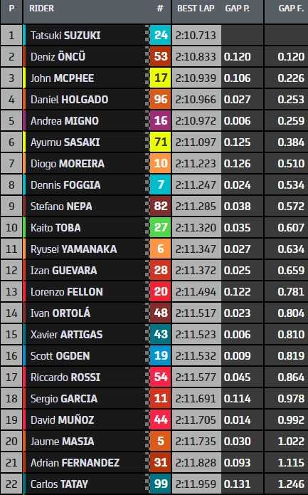 Tatsuki Suzuki a signé le meilleur temps de la troisième séance d’essais libres Moto3 du Grand Prix de Grande-Bretagne. Il devance au combiné le Turc Deniz Öncü et l’Écossais John McPhee. Le Français Lorenzo Fellon (13ème) a amélioré dans les derniers instants et rentre dans le top-14 directement qualificatif pour la Q2. Ce n’est pas le cas du leader du championnat, Sergio Garcia (18ème), qui devra disputer la Q1, à l’inverse de son dauphin Izan Guevara (12ème).