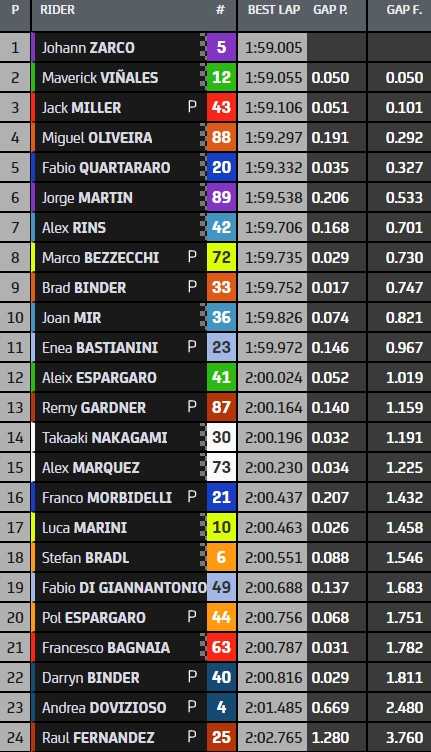 Johann Zarco a signé le meilleur temps de la quatrième et dernière séance d’essais libres, dédiée à la préparation de la course, à Silverstone. Le Français brille depuis le début du week-end, de même que son compatriote Fabio Quartararo. La séance a été marquée par une lourde chute pour Aleix Espargaro, qui a mis du temps à se relever mais n’est pas blessé. Place aux qualifications.