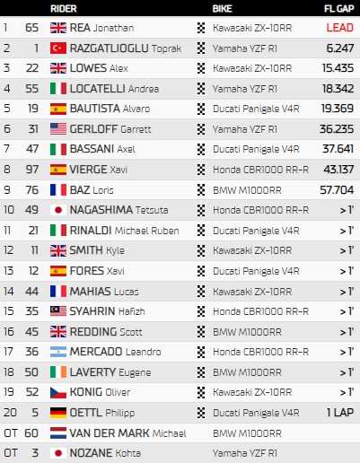 Troisième à l’arrivée, Alex Lowes place une deuxième Kawasaki sur le podium après s’être défait d’Andrea Locatelli (quatrième) et d’Alvaro Bautista (cinquième) en deuxième partie de course. Le Britannique a dû remonter sur les deux hommes car il est parmi les derniers à s’être arrêté, lui qui était alors en position de leader. Garrett Gerloff (sixième) est venu à bout d’Axel Bassani (septième) pour s’offrir la place de meilleur pilote indépendant du jour, lors de son dernier week-end chez Yamaha avant de rejoindre le team Bonovo Action BMW.