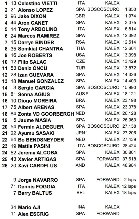 Dominateur, Vietti s'impose avec 1,8 seconde d'avance sur Alonso Lopez, solide second. L'Espagnol a résisté aux assauts de Jake Dixon (3ème) – qui décroche un deuxième podium de suite – et Aron Canet, battu par le Britannique dans le dernier tour. Tony Arbolino complète le top-5, mais à plus de 6 secondes du vainqueur.
