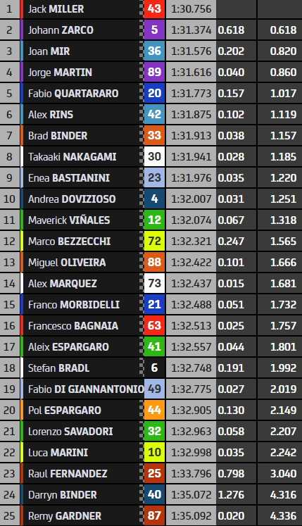 Jorge Martin (4ème) aurait pu signer un triplé pour Ducati, mais Joan Mir (3ème) l’en a empêché au guidon de sa Suzuki. Fabio Quartararo complète le top-5 à une seconde du meilleur temps, juste devant Alex Rins qui place une deuxième Suzuki aux avant-postes. Brad Binder (7ème) permet à KTM d’être dans le top-10 à domicile, tout comme Takaaki Nakagami (8ème) pour Honda. Les Italiens Enea Bastianini et Andrea Dovizioso en ferment la marche.